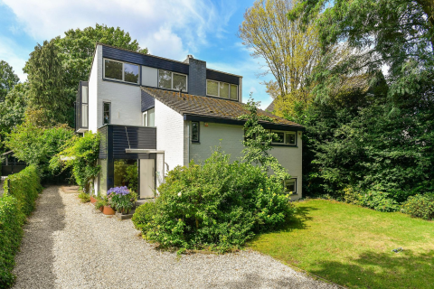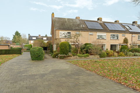 Het huis is midden op het perceel gesitueerd, waardoor er rondom ruimte is om heerlijk buiten te zitten. Het perceel loopt speels af naar het lager gelegen fietspad, waar naartoe een tuinpad slingert. Door deze hogere ligging kun je te allen tijde onbespied van je eigen privacy genieten. In de haag naast de parkeerplaats is een bescheiden schuur voor tuingereedschap en tuinmeubilair.