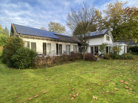 Vanuit de hal is de L-vormige woon-/ eetkamer bereikbaar (circa 43m²), die veel gezelligheid uitstraalt en een fraai zicht heeft op de tuin en de groene omgeving.